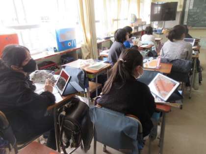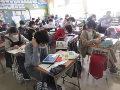現代社会の学習。今の社会情勢について子どもたちなりに考え合っています。