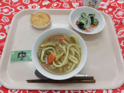 【献立】カレーうどん・わかめとしらすの酢の物・りんごケーキ・牛乳