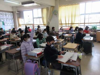 「モチモチの木」の学習。登場人物の気持ちを想像して感じたことを発表しています。