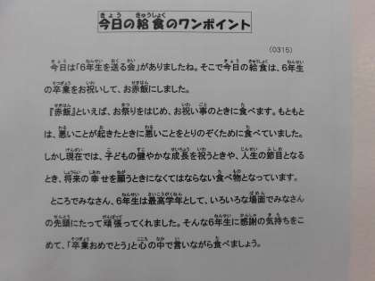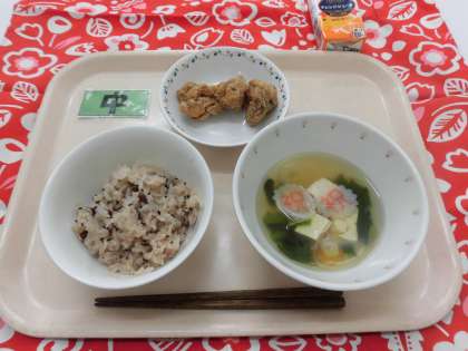 【献立】赤飯・とりのから揚げ・お祝いすまし汁・みかんジュース