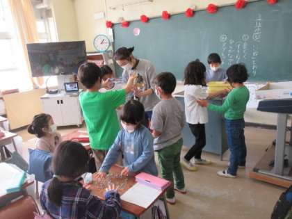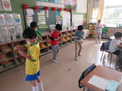 あやとり、おはじき、こままわしなど友達といっしょに昔遊びを楽しんでいます。
