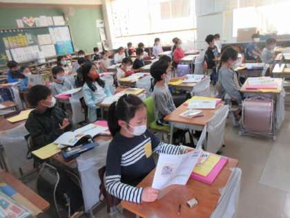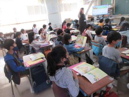 2年生は講師の先生との学習です。短時間ですが、大きな声を出さないで歌を歌っています。