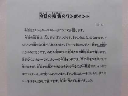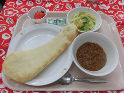 【献立】ナン・キーマカレー・キャベツサラダ・いちご・牛乳
