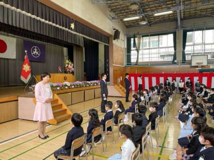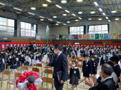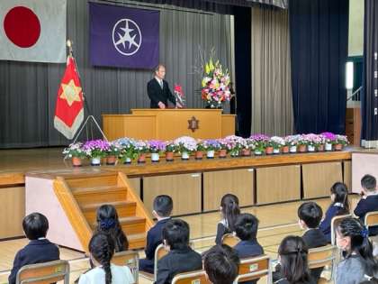 4クラスが揃って入場の後、校長先生から、お祝いの言葉がありました。担任の先生方との顔合わせです。