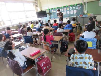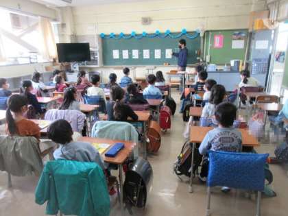 3,4組の様子です。先生の話をよく聞いています。まずは学校生活を知ることが学習です。