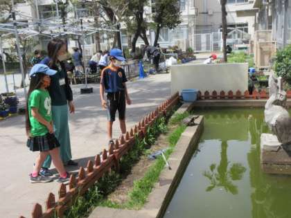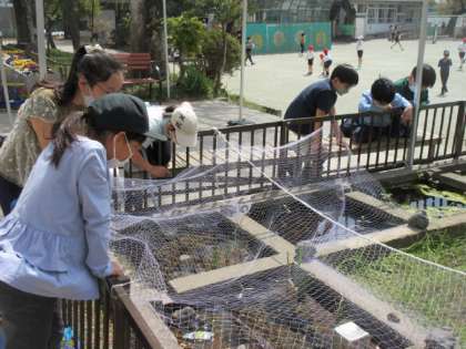 かめのひなたやメダカの池を眺めていたり、委員会の子どもたちが飼育小屋のそうじをしたりと心穏やかな時間が流れています。