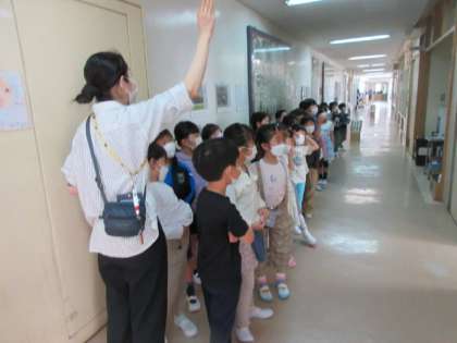 校舎内の見学。1年生は学校を知ることが学びです。並んで静かに歩いて見学ができています。
