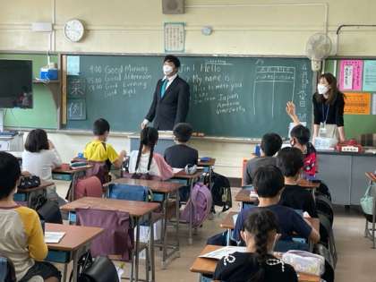 今年度はALTのハンター先生と一緒に学習します。時刻に合わせたあいさつを学びました。