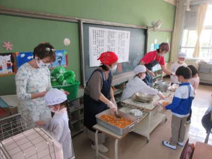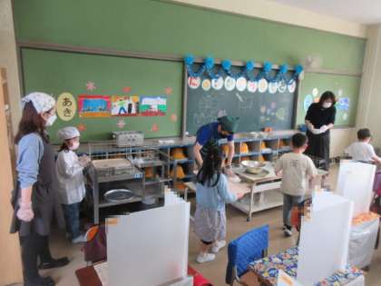 3,4組の様子です。給食のルール、配膳や片付けの仕方を学びます。