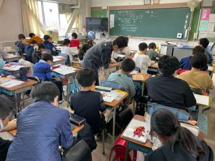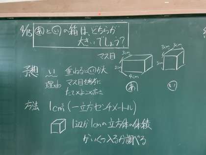 二つの箱の大きさを比べます。立方体のブロックかいくつ入るかを調べています。