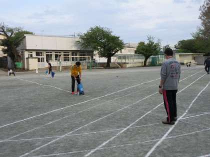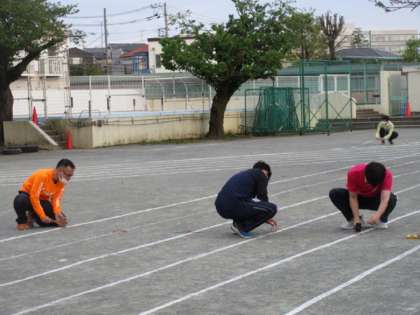 先生たちが校庭でラインを引いたり、ペグを打ったりしています。運動会に向けた準備が始まりました。