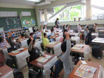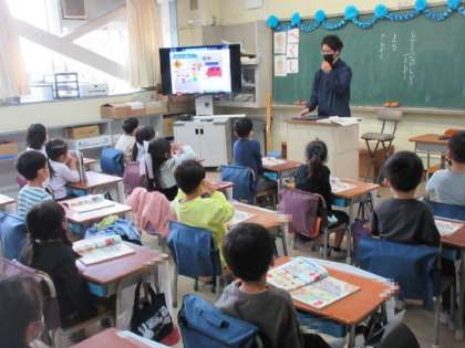 形の学習。教科書の絵の中から真四角や長四角などの形を見つけています。子どもたちは進んで発表しようとしています。