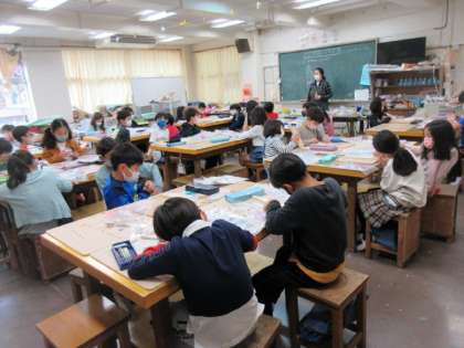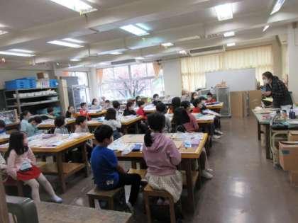 3年生から図工室での学習。図工の学習も先生の話をよく聞くことから始まります。
