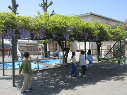 藤棚の藤の花が紫色のきれいな花を咲かせています。