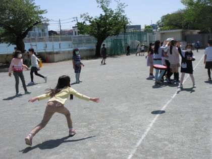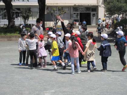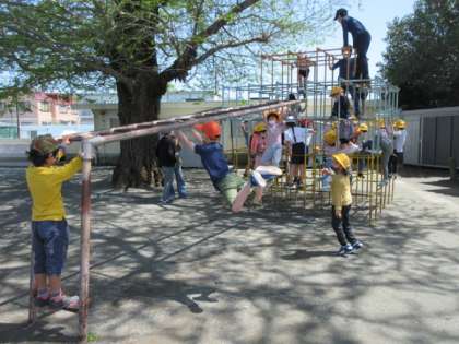 気持ちのよい日です。友だちや先生と元気に楽しく遊んでいます。