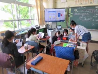 学習用端末を使って係活動をしています。子どもたちは友達とよく話し合いながら活動しています。