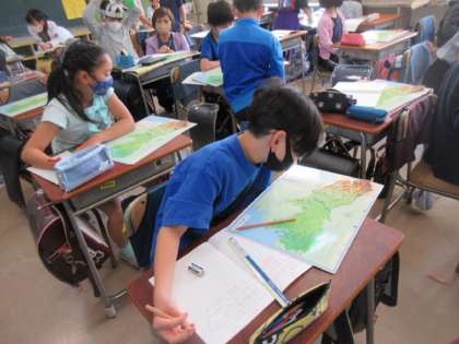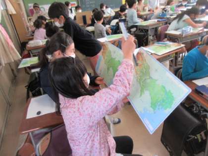 4年生の社会科は東京の学習で今日は地形の様子です。自分で作った立体地図をよく観察しながら、東京の地形の特徴を見つけ出していました。