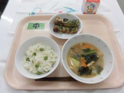 【献立】グリンピースごはん・ちくわの磯辺揚げ・具だくさんみそ汁・牛乳