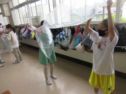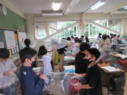 ビニール袋に空気を詰め込んで、それを押したり、浮かばせたり。子どもたちは空気の性質を体感しています。
