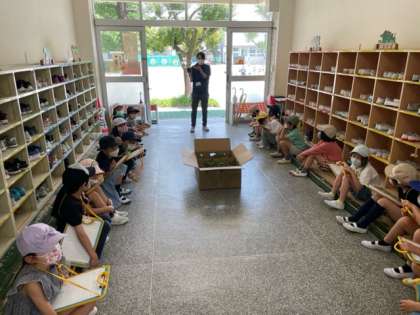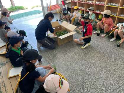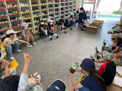 ミニトマトのかんさつ。一人一つずつ苗を育てます。今日は観察をします。