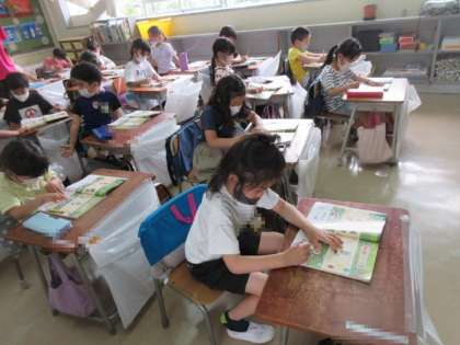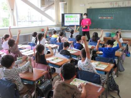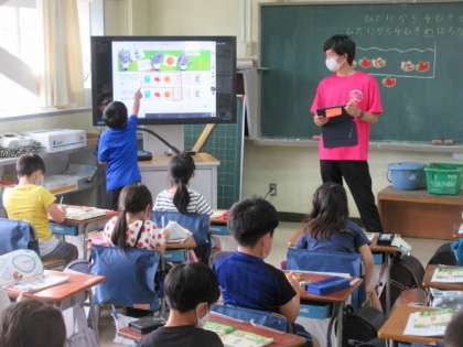 初任の先生の算数の授業。左から3個と3個目の違いをみんなで考えていました。