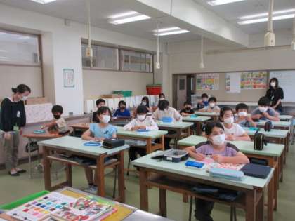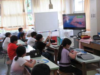初めての裁縫の実習。動画を見ながら基本の技能のたま止めに挑戦。学習支援ボランティアの方にサポートで授業に入っていただいています。