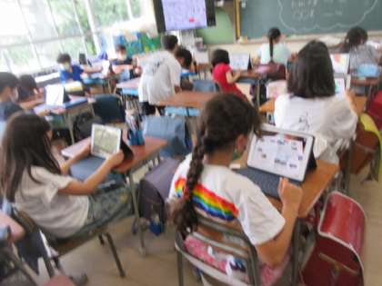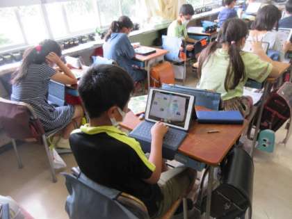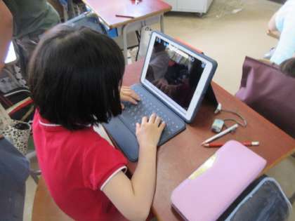 タブレットで友達がまとめたワークシートを見て、いいところを見つけています。