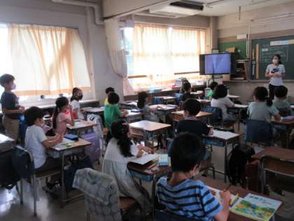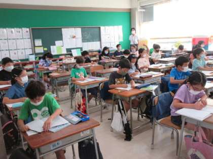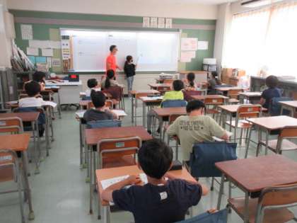 少人数学習でわり算の学習。算数では自分の考えをノートに書いたり、考えたことを発表し合ったりすることを大切にしています。