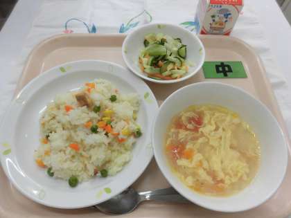 【献立】鮭ピラフ・キャベツサラダ・卵スープ・牛乳