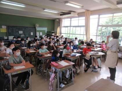 来週から歯の衛生週間。保健室の先生が健康な歯についての授業をしています。