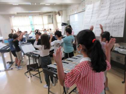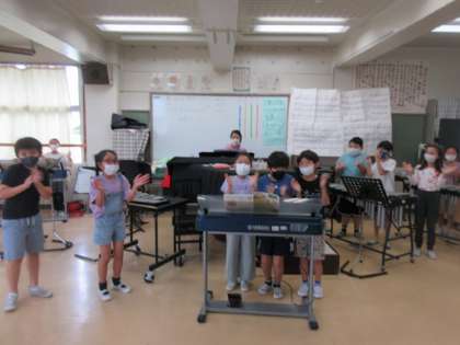 みんなで曲に合わせてふりをつけたり、合奏したり楽しく学習しています。今日誕生日の私(校長)にサプライズで「ハッピー・バースデー」の歌のプレゼントがありました。