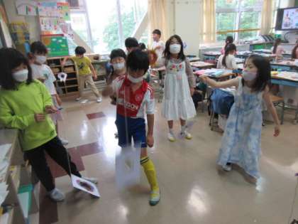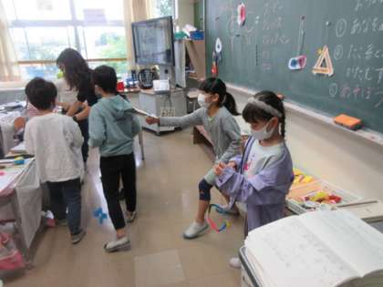 自分で作った紙けん玉で友達と楽しく遊んでいます。
