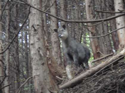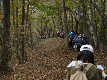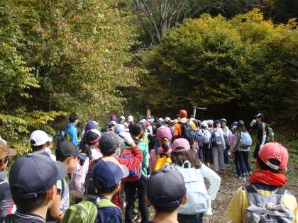 登りよりも、急傾斜を下りるときのほうが怖かったです。途中で、カモシカが林道の近くまで下りてきていました。みんなが静かに通ったので、先頭の人も最後尾の人もじっくりとカモシカを見ることができました。カモシカもみんなをじっと見ていました。