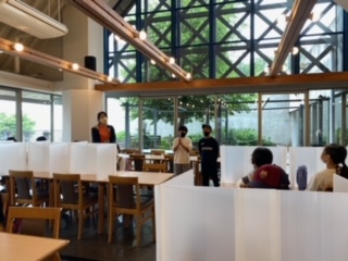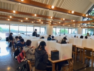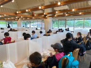 食堂でお弁当です。お家の人が作ってくださったお弁当を美味しくいただいています。