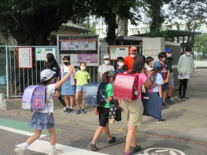環境美化委員の5年生が委員会活動の一環として朝正門であいさつ運動をしていました。5年生は川場で学んだ経験を生かして頑張っています。
