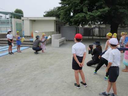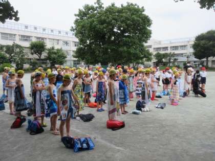 プール前の校庭でプール開きをしました。4年生はひとクラス当たりの人数が多いので2学級ずつでプールに入ります。