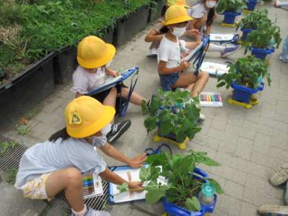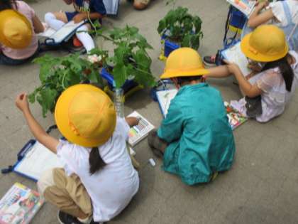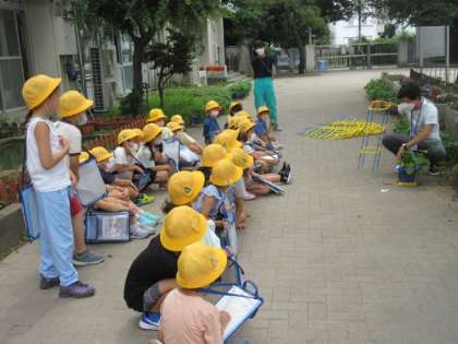 1年生は自分の植木鉢でアサガオを育てています。観察をしながらアサガオの成長を感じています。ずいぶんと成長したのでこれから支柱を立てます。