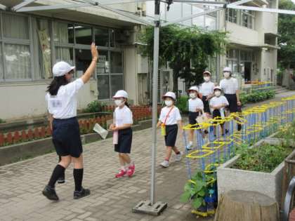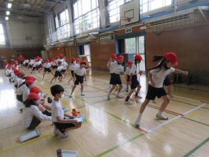 反復横跳び、立ち幅跳び、ソフトボール投げなどの記録を測定します。1年生には6年生が、2年生には5年生がサポートをしてくれています。