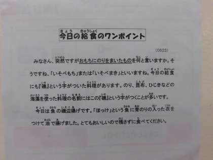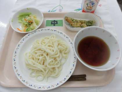 【献立】冷やしうどん・魚の磯辺揚げ・ひと塩野菜・牛乳