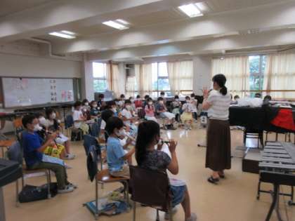 3年生からリコーダーの学習が始まります。先生から吹き方の基本を教わっていました。