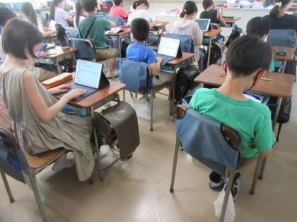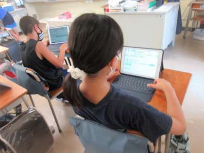 5年生はタブレットを使って、楽しかった川場移動教室のまとめをしています。