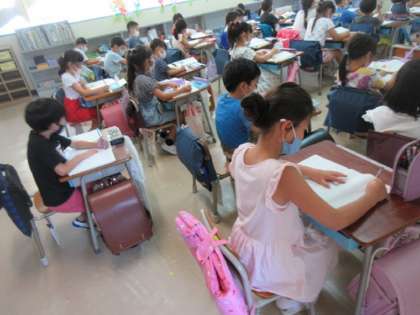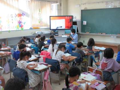先生が書いているノートを大型テレビに映し出しながら、ノートの描き方を丁寧に教わっています。