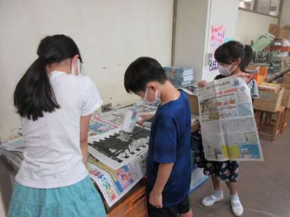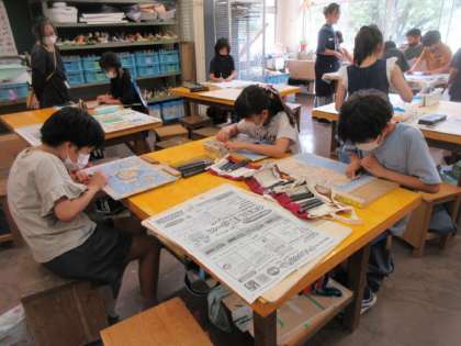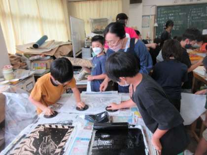 初めての彫刻刀で版画に挑戦。下絵にそってほり進め、黒インクで刷り、最後はアイロンで乾かすとできあがりです。