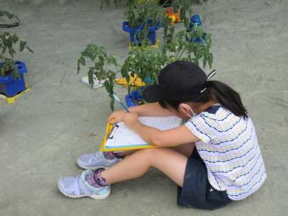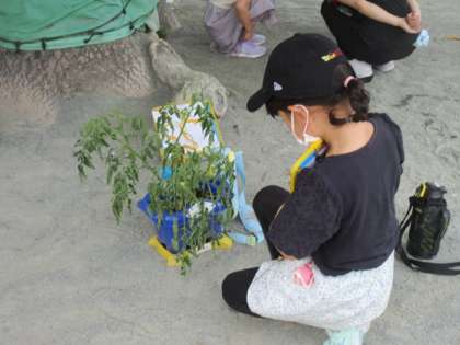 育てているミニトマトに緑色の実がなり始めました。暑さで葉が少し元気でなくなりましたが、この後水やりをします。