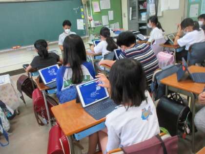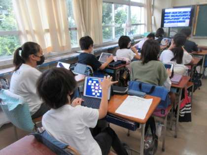 自分を見つめるために自分の木になることをタブレットに書き出しています。ロイロノートで互いに書いたものを共有しています。