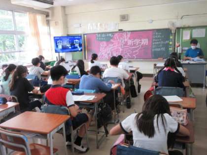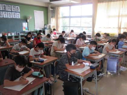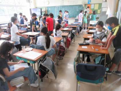 4年生から6年生の様子です。4年生はこの後夏休みの自由研究を見合う準備をしていました。5年生は算数のレジネス・テスト。6年生の教室には担任の先生の熱いメッセージが書かれていました。