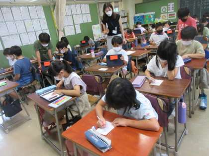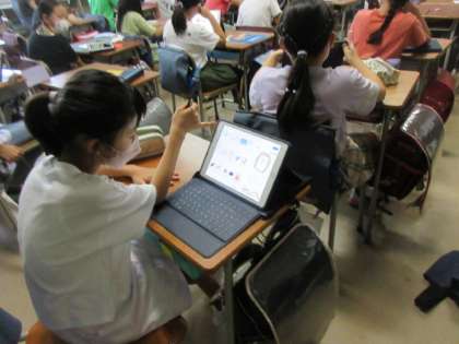 クラス目標に添えるクラスのオリジナル・キャラクターを考えていました。タブレットを使ったり、友達と相談したり、楽しそうです。
