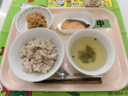 【献立】梅茶漬けごはん・汁・鮭の塩焼き・切り干し大根の煮つけ・牛乳