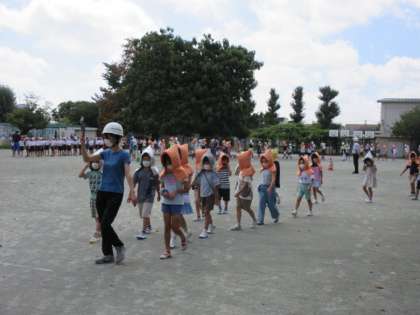 今日の想定は地震です。自分の机の下に隠れた後、「お・か・し・も」の4つの約束を守って、全員が校庭に避難しました。