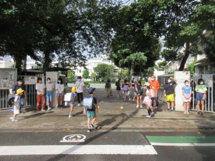 環境美化委員の6年生が正門であいさつをしていました。前期の委員会は9月末まで。できることに取り組んでいます。